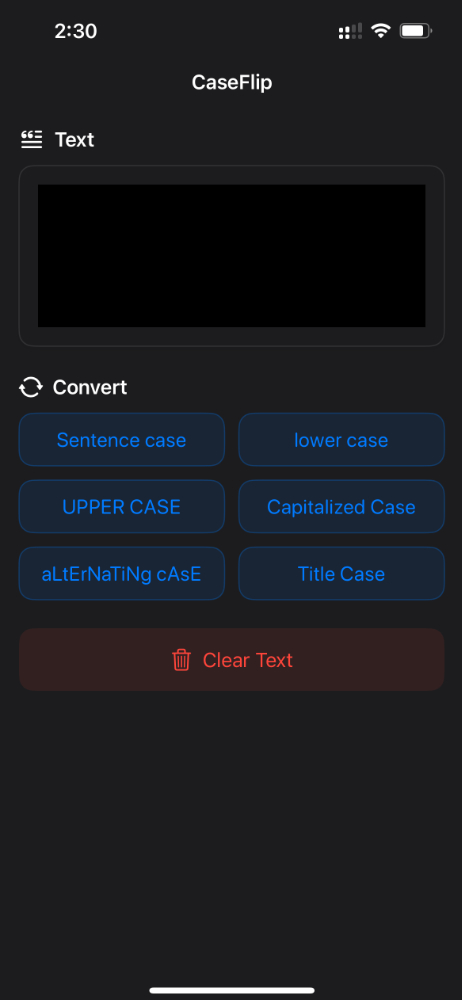 Quickly and easily convert text between different cases like sentence case, lowercase, UPPERCASE, Capitalized Case, aLtErNaTiNg CaSe and Title Case with CaseFlip for iPhone. Simply enter or paste your text and tap to convert and copy to the clipboard. The intuitive interface makes case conversion a breeze.